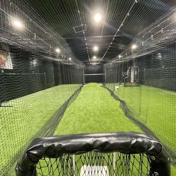 3-wheel baseball pitching machine, we can throw pitches up to 100mph, and it has a bucket feeder that will disperse balls automatically. Our indoor facility is open to all ages